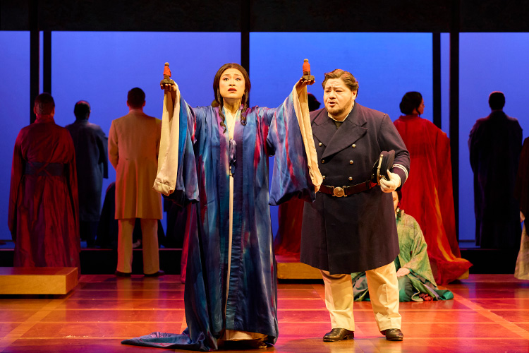 Sharpless appears with Pinkerton and Kate, Pinkerton’s new wife. Suzuki realises who the American woman is. Pinkerton is overcome with guilt and leaves rather than face Cio-Cio-San. Cio-Cio-San rushes in hoping to find Pinkerton, but sees Kate instead. Grasping the situation, she agrees to give up the child but insists Pinkerton return for him. Dismissing everyone, Butterfly takes out the dagger with which her father committed suicide, choosing to die with honour rather than live in shame.